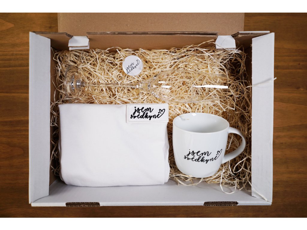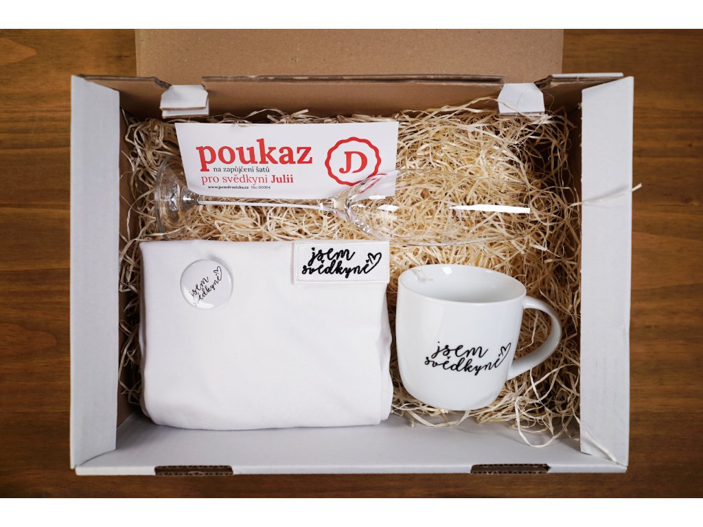 Přemýšlíte, jak originálně požádat svou kamarádku, aby Vám šla za svědkyni? Veký box se všemi produkty je tou nejlepší volbou! Hodí se jak na rozlučku se svobodou, tak na svatební přípravy. Hrnek na ranní kávu, sklenku na dopolední mimózu, placku a tričko s vyměnitelnou nášivkou využije každá z vás. V nabídce nezapomeňte zvolit velikost trička a typ druhé, vyměnitelné nášivky.